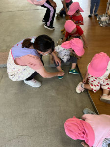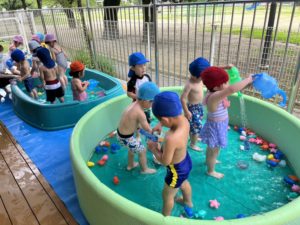 もも組は初めて水遊びをする子もいるので、最初は少ない水からのスタートです!