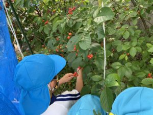 ポロポロとれるさくらんぼに、「簡単にとれた!」「両手いっぱいにとれたよ~!!」と嬉しそうな子どもたち☺