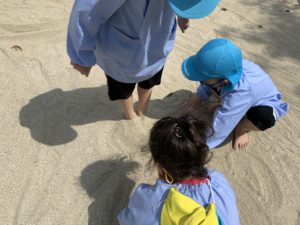バンカーの砂で山を作ったり、穴を掘ってみたり