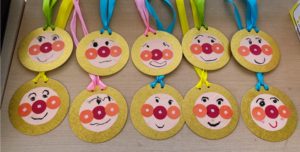 顔を描く人、鼻をのりで貼る人と役割分担をし、友だちと協力しながらアンパンマンのメダルを作りました。