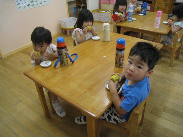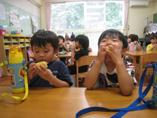 みんなにむいてもらったトウモロコシ🌽を茹でておやつに出しました!