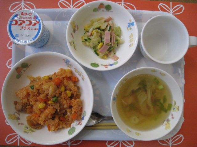 チキンライスには、鶏肉・にんじん・コーン・玉ねぎ・グリーンピースが入っており、みんなたくさん食べてくれました!