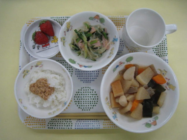 年長すみれ組さんのリクエストメニュー、関東風煮です。かつお、昆布で出汁を取りコトコト煮込みました。子どもたちはお出汁までしっかり飲んでしまいます🎵