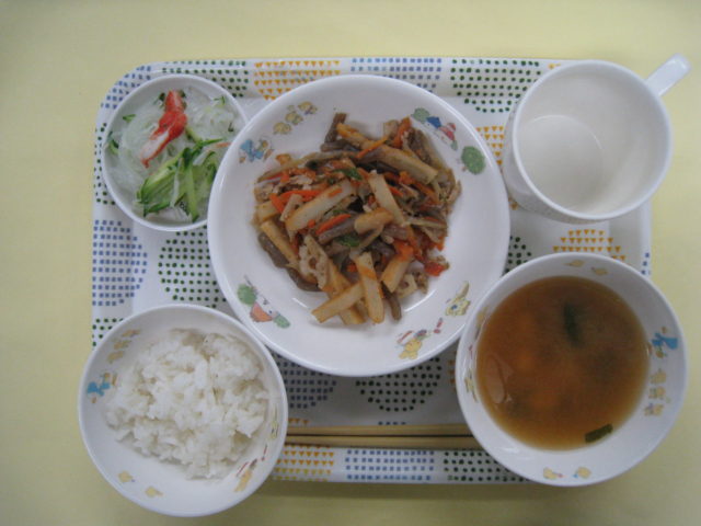 子どもたちの大好きな、栄養きんぴらです。れんこんやごぼうが入っていて、かみかみを頑張るメニューです。仕上げにすりごまを入れることで、優しい味になります。