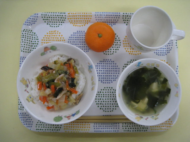 野菜がたっぷりの中華丼。どのクラスもペロリと完食です。「中華なのに、から揚げないの❓」さすが年長さんです。給食のメニューが想像できちゃいます💦