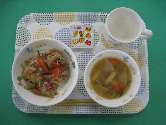 牛丼は子どもたちにも、先生にも大人気です🎵国産牛肉、玉ねぎ、長ねぎをたっぷり使用しました。