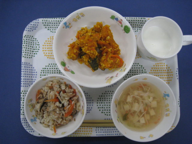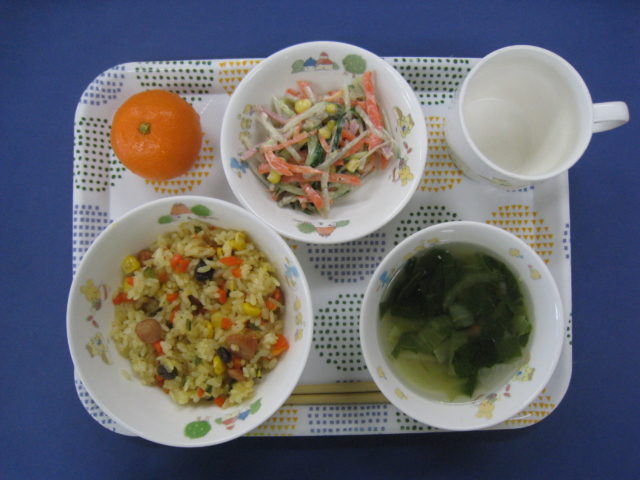 カレーピラフには、干しぶどう🍇が入っています。子どもたちはぶどうが入っていると、とても嬉しいようです🎵カレー味は大人気です。