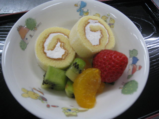 おやつは、ロールケーキとフルーツのセットです🎵