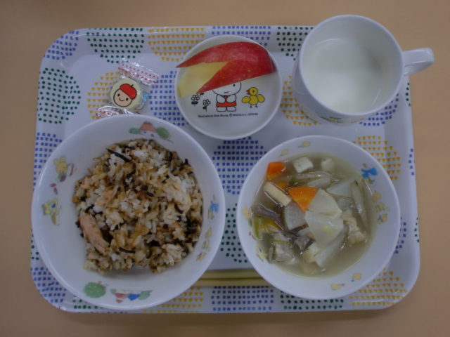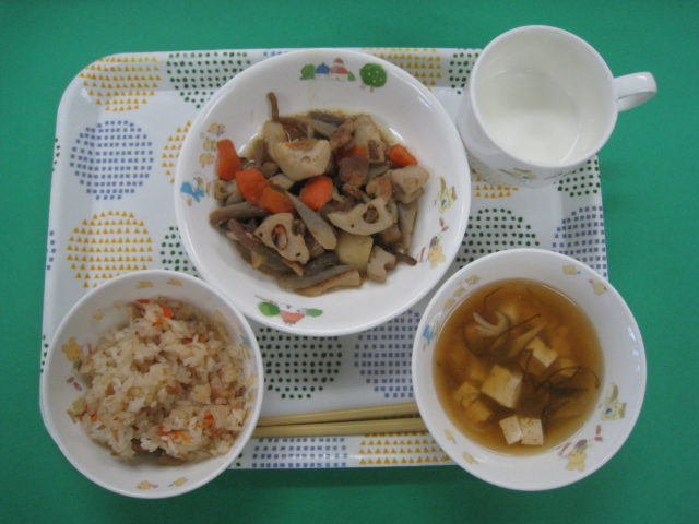 ごぼう、れんこん、里芋、人参と根菜がたっぷり入った筑前煮です。ちょっぴり苦手な子もいたようですが、しっかり噛んで食べてくれました。