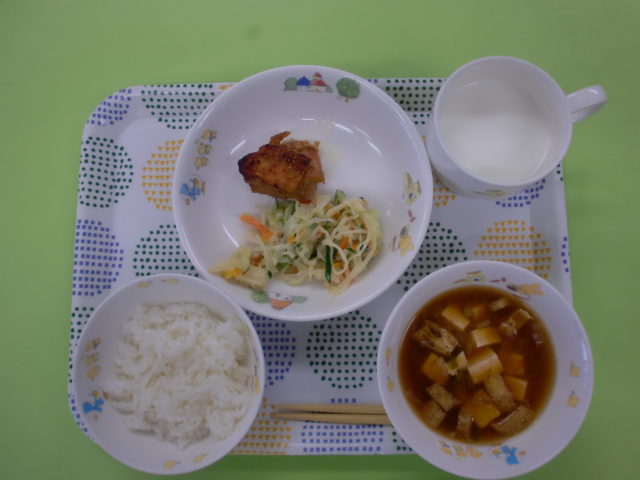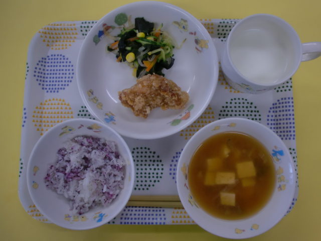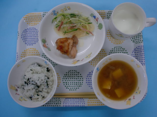 今日は白いごはんの予定でしたが、暑い日は白いごはんが残ることが多くなってきたので、食べやすいゆかりごはんに変更しました(*^^)v