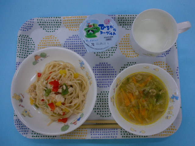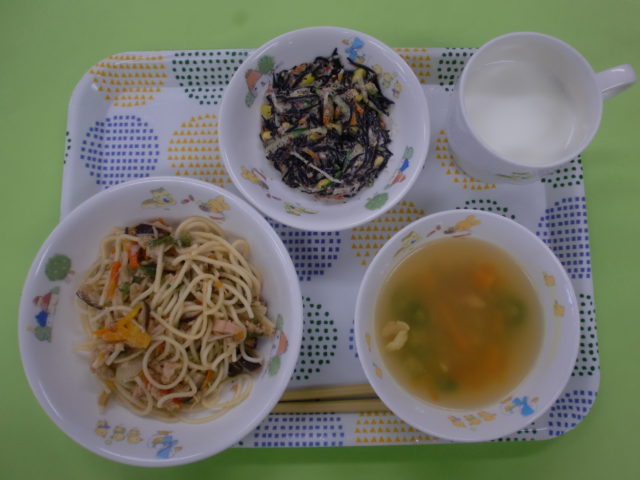 子どもたちの大好きなスパゲティ♪です。干ししいたけ、えのきたけ、ツナが入っていて、味は和風だしで仕上げました。