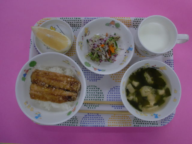 これからの暑い時期にピッタリの献立です!(^^)!タンドリーチキンといえば、ヨーグルトで漬けるのが一般的ですが、保育園ではレモン果汁を入れてさっぱりした味付けにしています😋