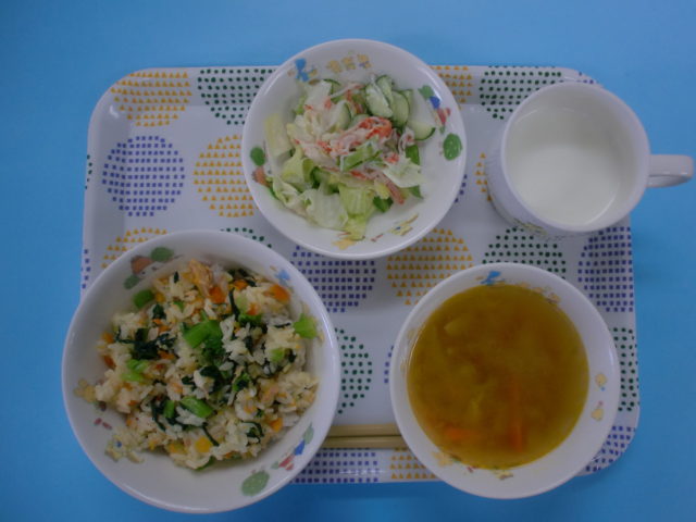 小松菜は1年中、手に入りやすい野菜ですね🎵苦手な子もいますが、ツナやウインナー、コーンを一緒に使うことで子どもも食べやすくなります(*^^)v今日のピラフもツナが入っています💛