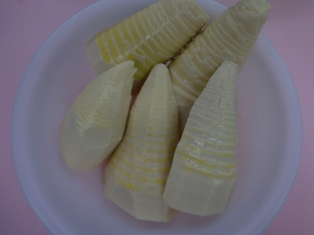 昨日のたけのこの中身がわかるように、今日は1階の給食のサンプルケースの横に水煮の状態の展示をしています(*^-^*)