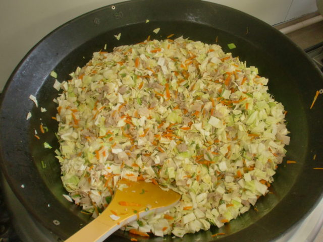 野菜がたくさん入ると、水分でベタベタになってしまう焼きそばですが、保育園では別の釜で麺だけを焼き、麺の水分を飛ばしてから野菜の中に入れるので、野菜からでたうま味の水分だけを麺が吸収するので、ベタベタせず、とても美味しい焼きそばができます💛