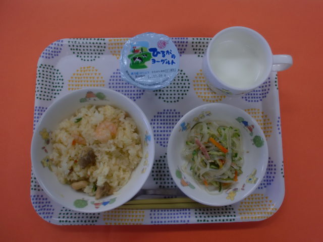 大人気のピラフです🎵プリプリ海老とチキンが入っていますよ。「せんせー、ぼくの海老さんが5個も入っとったよ🦐」とニコニコ顔😊です。