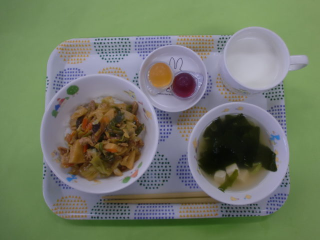 🦊きつね丼には、油揚げ、玉ねぎ、青ネギがたっぷり入っていますよ。大人気の🍚どんぶりメニューで、年長すみれ組さんのリクエスト給食です😊