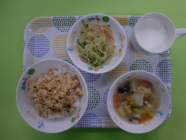 子どもたちの大好きな丼メニューです🎵いつもの三色丼は卵を使用しますが、コーンに変更しましたよ。