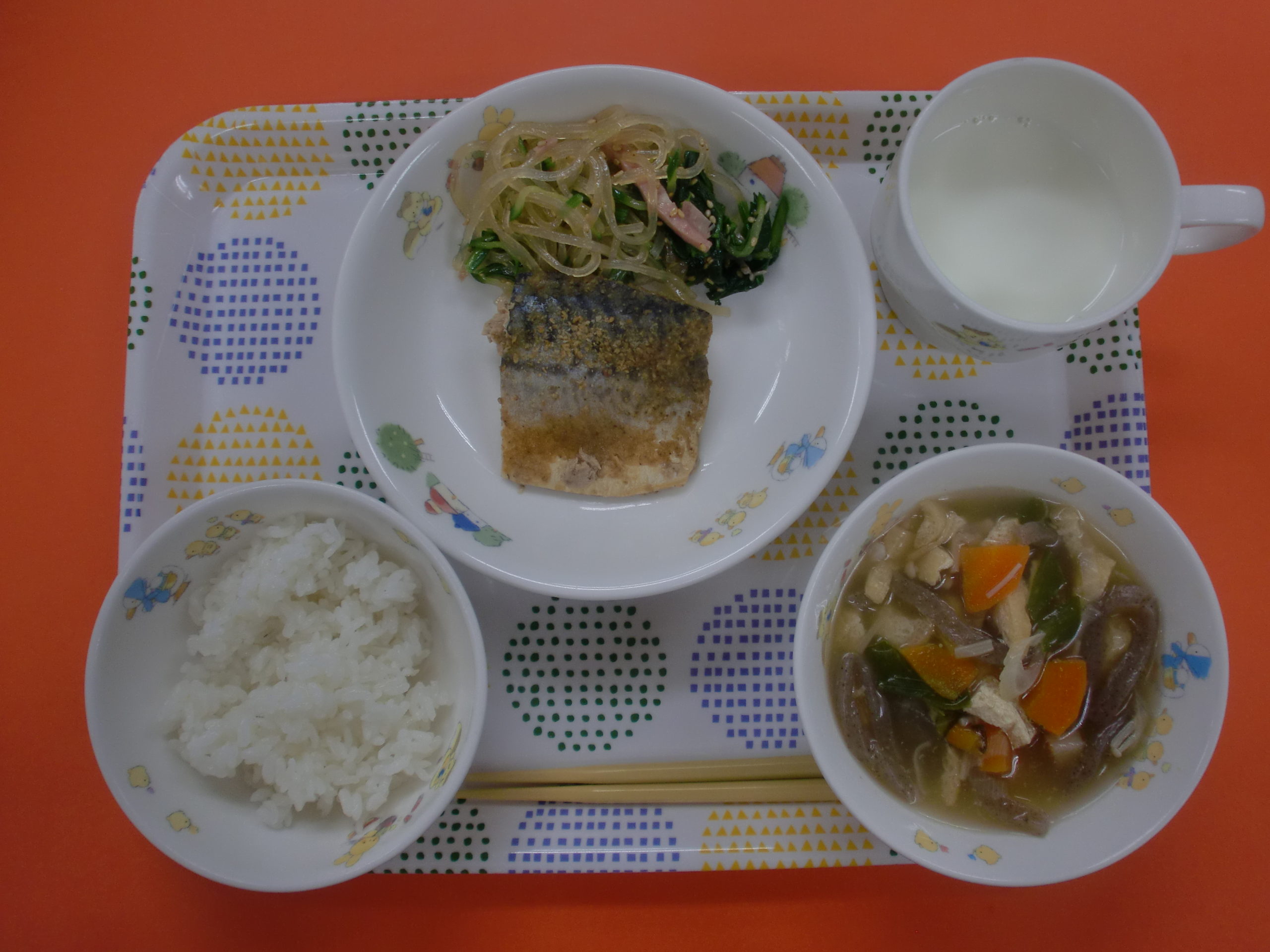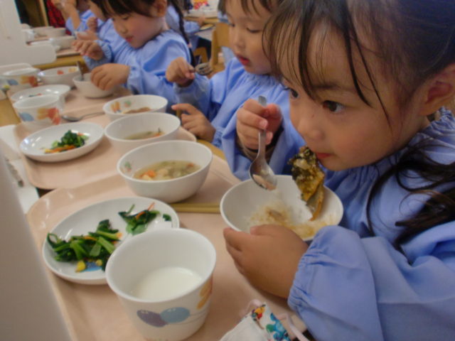 保育園の秋刀魚は骨も入っていますが、柔らかく調理しているのでみんなよく噛んで骨も一緒にカブっと食べています💛