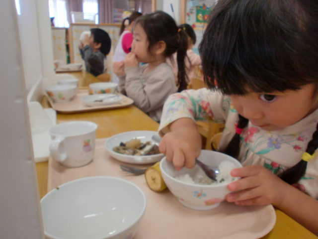以上児クラスは今年度初めての黒米入りごはん😊ごはんに入っている黒米が気になる子もいたようです(^^;