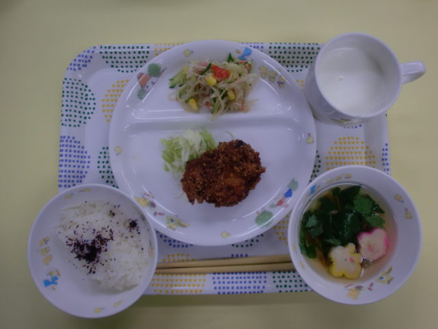 かみかみサラダは、さきいかや大豆が入っていて、名前のとおりかみかみするメニューですがみんなよく噛んで頑張って食べていました☺