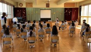 遊戯室でももぐみ、さくらぐみ、ゆりぐみからのビデオメッセージをみたり、