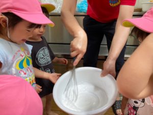 まず、石鹸が入った水を泡だて器で泡立てていくよ🌟