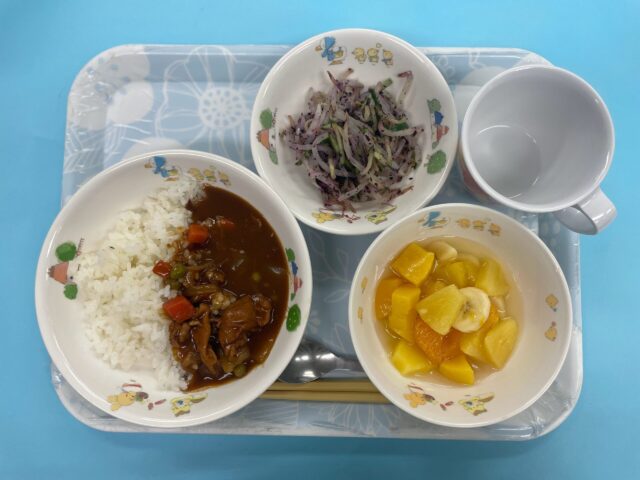 久しぶりの給食でしたが、人気のハヤシライスとゆかり和え、フルーツポンチ