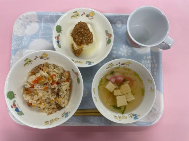 今日の給食にはかみかみライスに大豆、豆腐の肉みそかけに豆腐・みそ、すまし汁に豆腐・醤油、