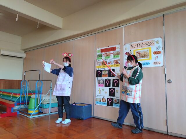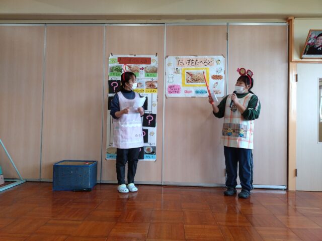 給食の前に給食室から『大豆を食べると何がよいのか・大豆は何に変化するのか』についてのお話・クイズをしました!